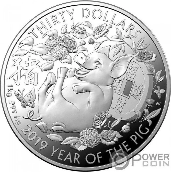 Happy Pig on its back with lucky hydrangeas, a cash coin for wealth (Lu) on the right, and the Chinese character for Pig on the left.