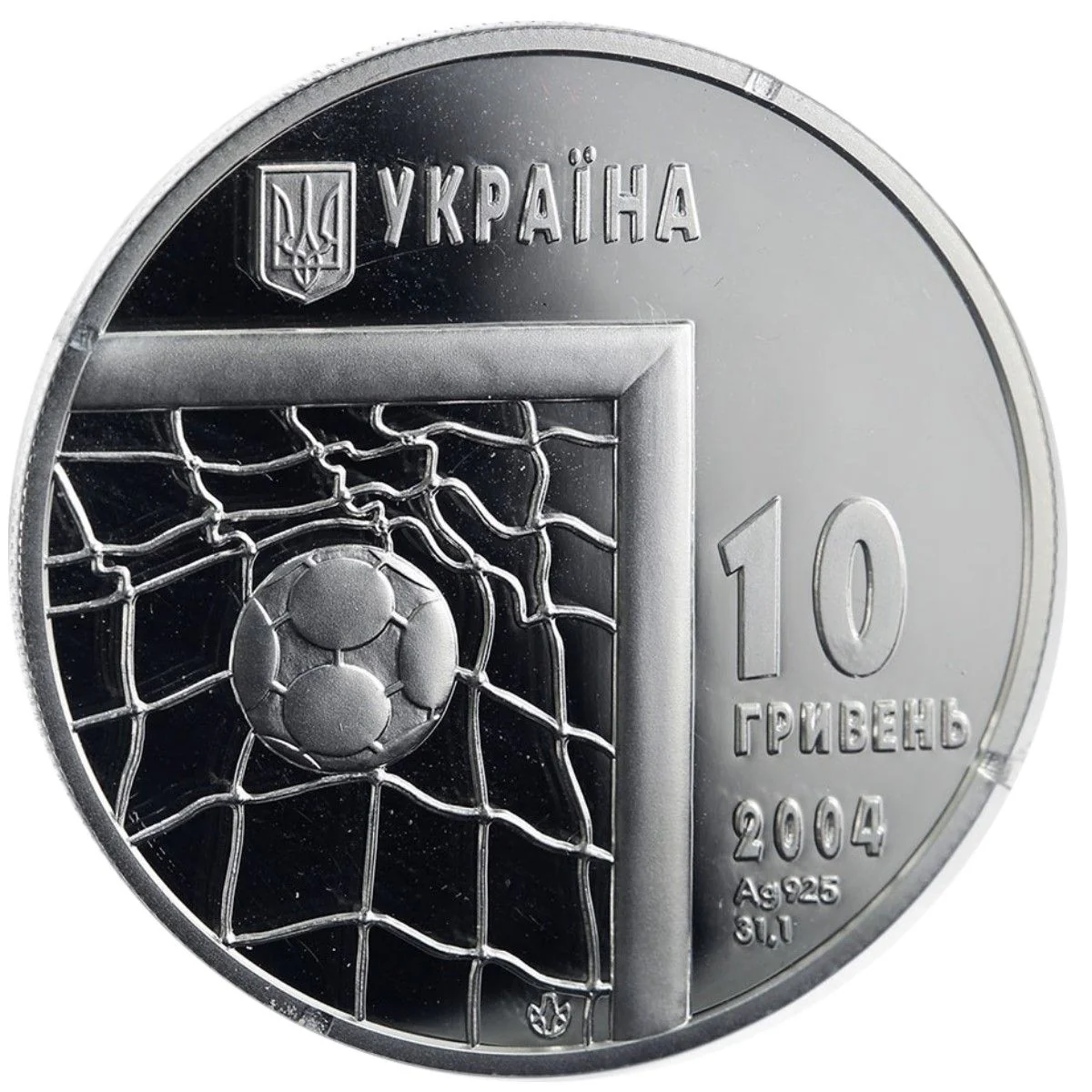 A ball is engraved in the goal. Above it are the small State Emblem of Ukraine and the inscription УКРАЇНА. To the right are the inscriptions: 10 ГРИВЕНЬ 2004, the metal specification, and the Mint logotype of the National Bank of Ukraine.