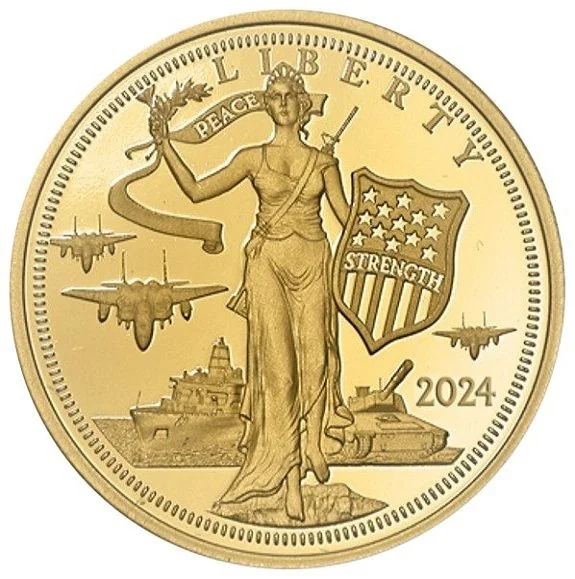 Lady Liberty strides forward, shielded and flanked by modern arms.