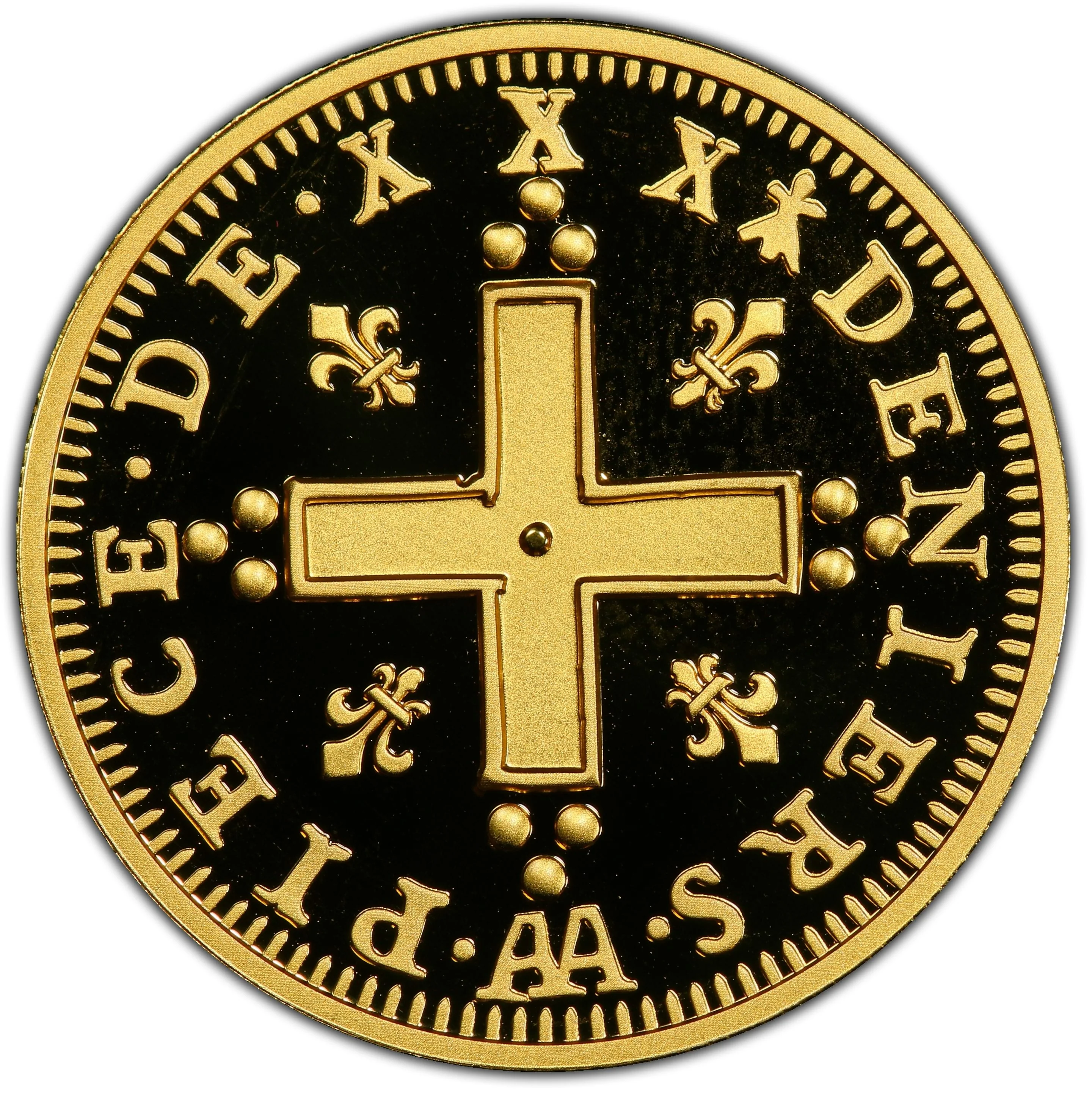 Cross with three bezants on each arm, cantoned by four fleurs-de-lis.