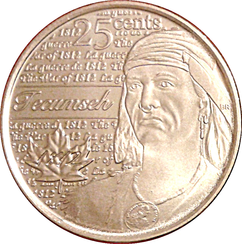 Tecumseh facing left, wearing a medal. Maple leaf with "1812" at bottom left, designer's initials at right.