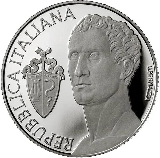 Bust of Antonio Canova with his coat of arms, from his tomb in Possagno's Canova Temple. Around: "REPUBBLICA ITALIANA"; on right: signature "U. PERNAZZA".