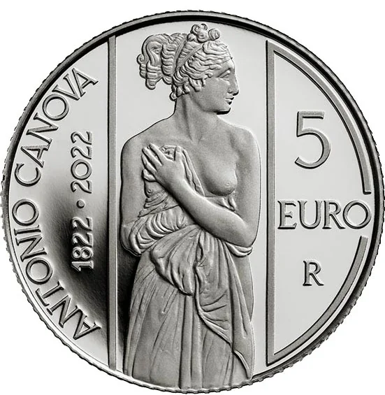 Center: detail of Canova's "Venere Italica" statue. Right: "5 EURO" and mint mark "R". Left: dates "1822 - 2022". Edge inscription: "ANTONIO CANOVA".