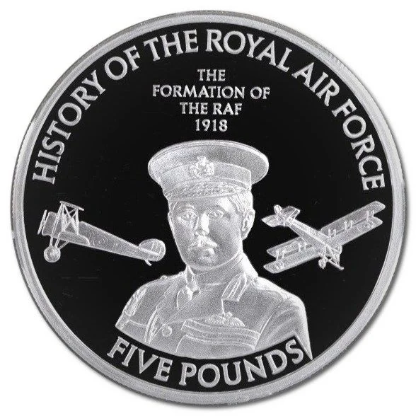 Portrait of Sir Hugh Trenchard, "Father of the RAF," flanked by two planes with denomination below.