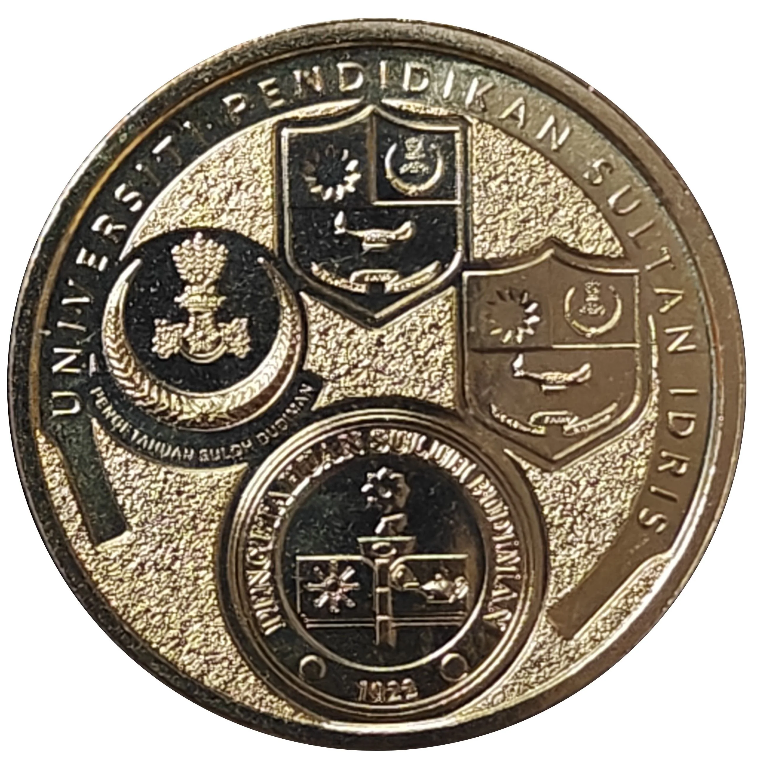 Description: The top circumference displays "BANK NEGARA MALAYSIA" and the bottom shows "1 RINGGIT." The UPSI100 logo and an open book, symbolizing abundant knowledge, are featured.