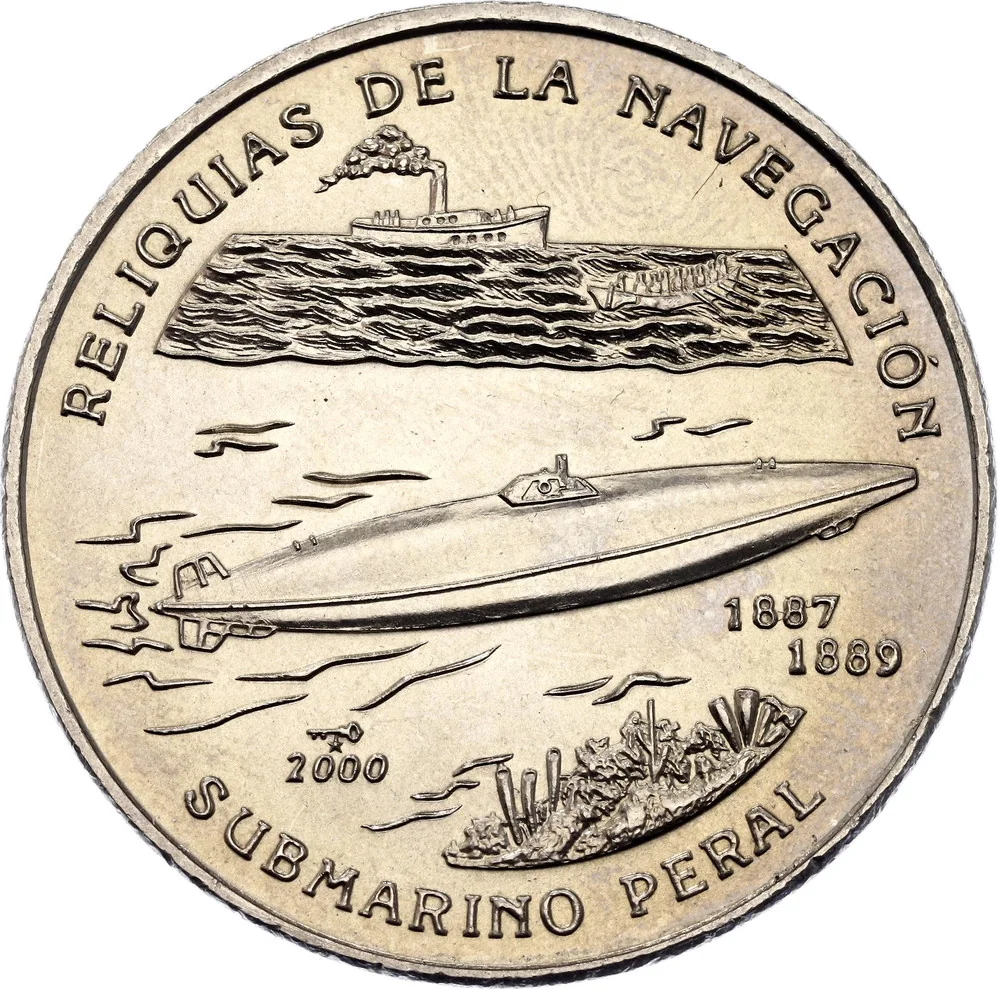 Ship and rescue boat above, Peral submarine below. Years of operation on right, issue year and mintmark lower left.