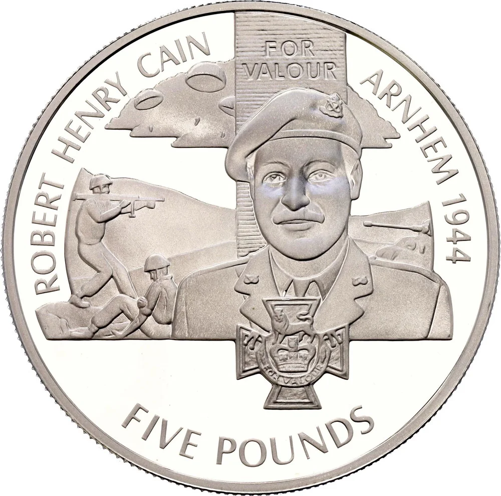 Portrait of Victoria Cross recipient Robert Henry Cain with a war scene behind him.