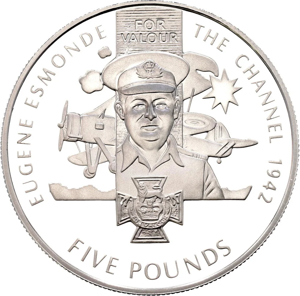 Portrait of Victoria Cross recipient Eugene Esmonde with a wartime airplane behind him.