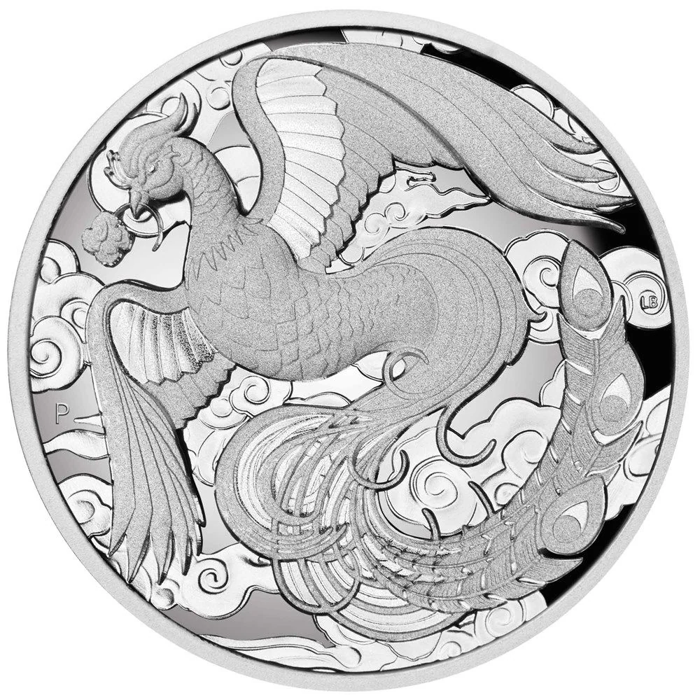 A phoenix, composed of various bird features, holds a paulownia flower in its beak—the only tree it perches on. Stylized clouds, symbols of abundance and good fortune, complete the design.