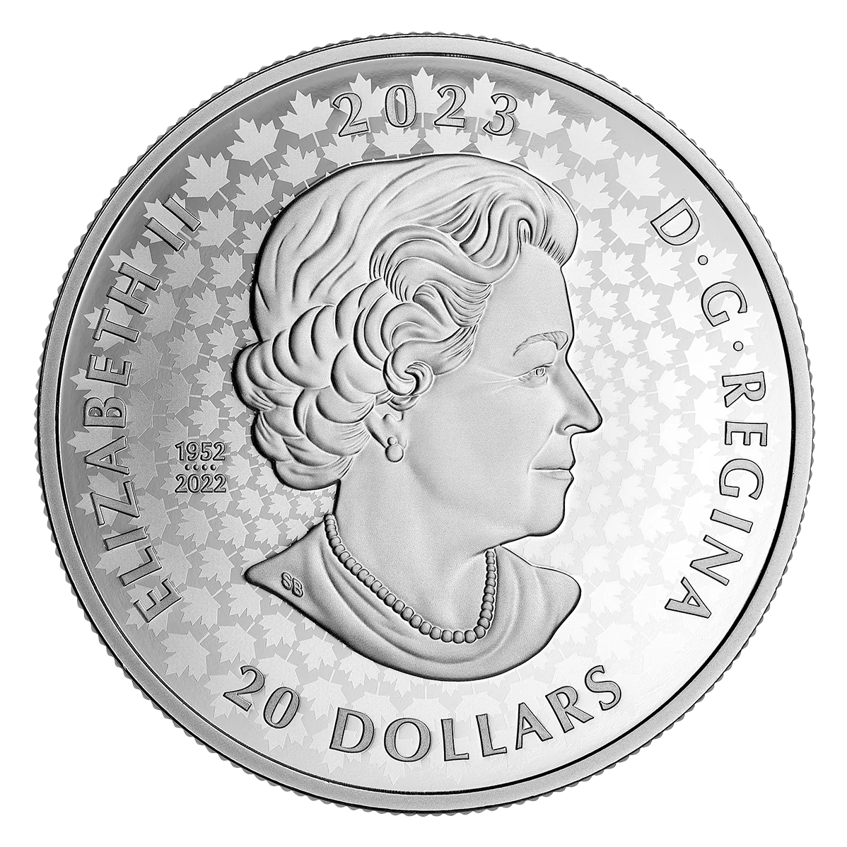 Queen Elizabeth II at 77, facing right, wearing a necklace and earrings. The effigy includes the dates "1952" and "2022," separated by four pearls representing her four Canadian coin portraits.