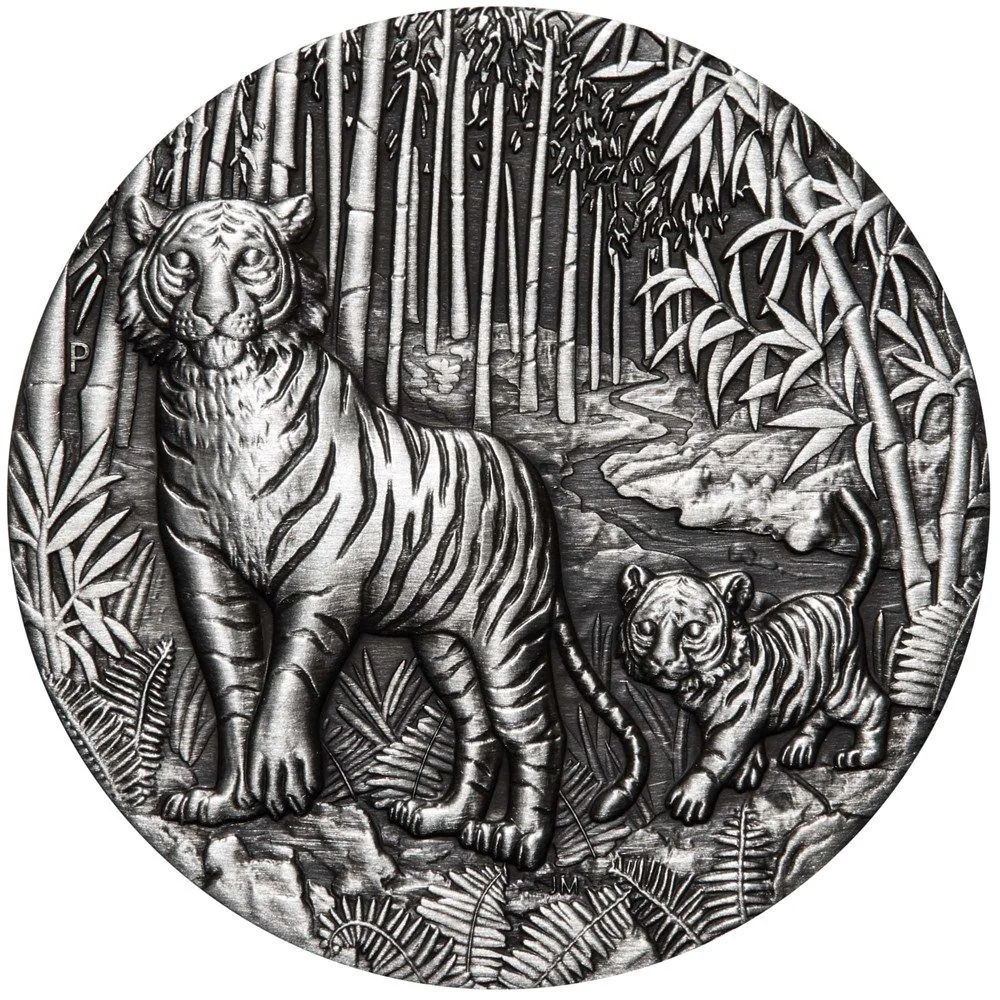 A tiger cub follows its protective parent through rocky terrain with ferns and bamboo.