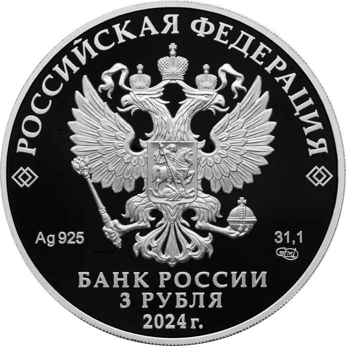 The obverse features the Russian coat of arms, inscriptions for "Russian Federation" and "Bank of Russia," the denomination "3 Roubles," the issue year "2024," the metal's chemical symbol, fineness, mint mark, and fine metal content.