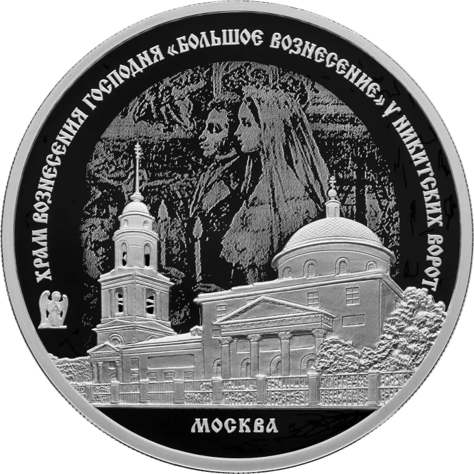 The reverse depicts the Great Ascension Church, laser-treated for a matte finish, set against the wedding of Pushkin and Goncharova. An angel is in relief on the left. Inscriptions around the top read 'ХРАМ ВОЗНЕСЕНИЯ ГОСПОДНЯ ‘БОЛЬШОЕ ВОЗНЕСЕНИЕ’ У НИКИТСКИХ ВОРОТ' and 'МОСКВА' at the bottom.