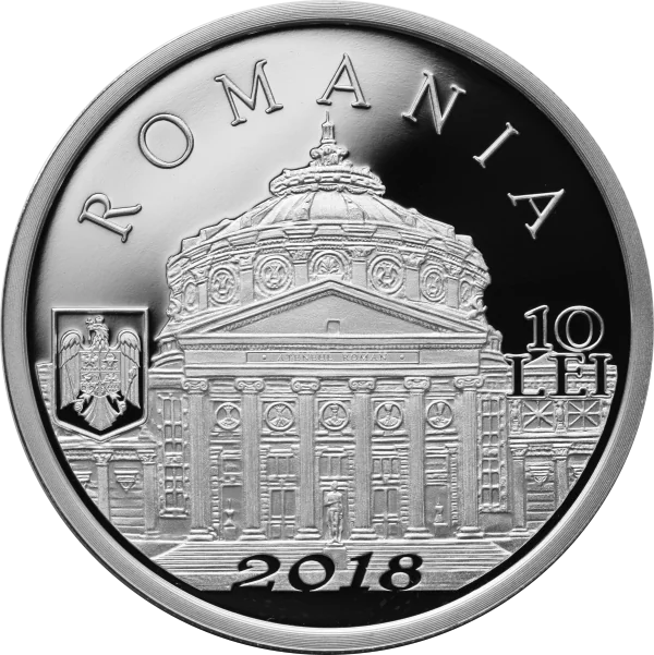 The Romanian Athenaeum in Bucharest, with "ROMANIA" arched above, "10 LEI" face value, Romania's coat of arms, and the year "2018".