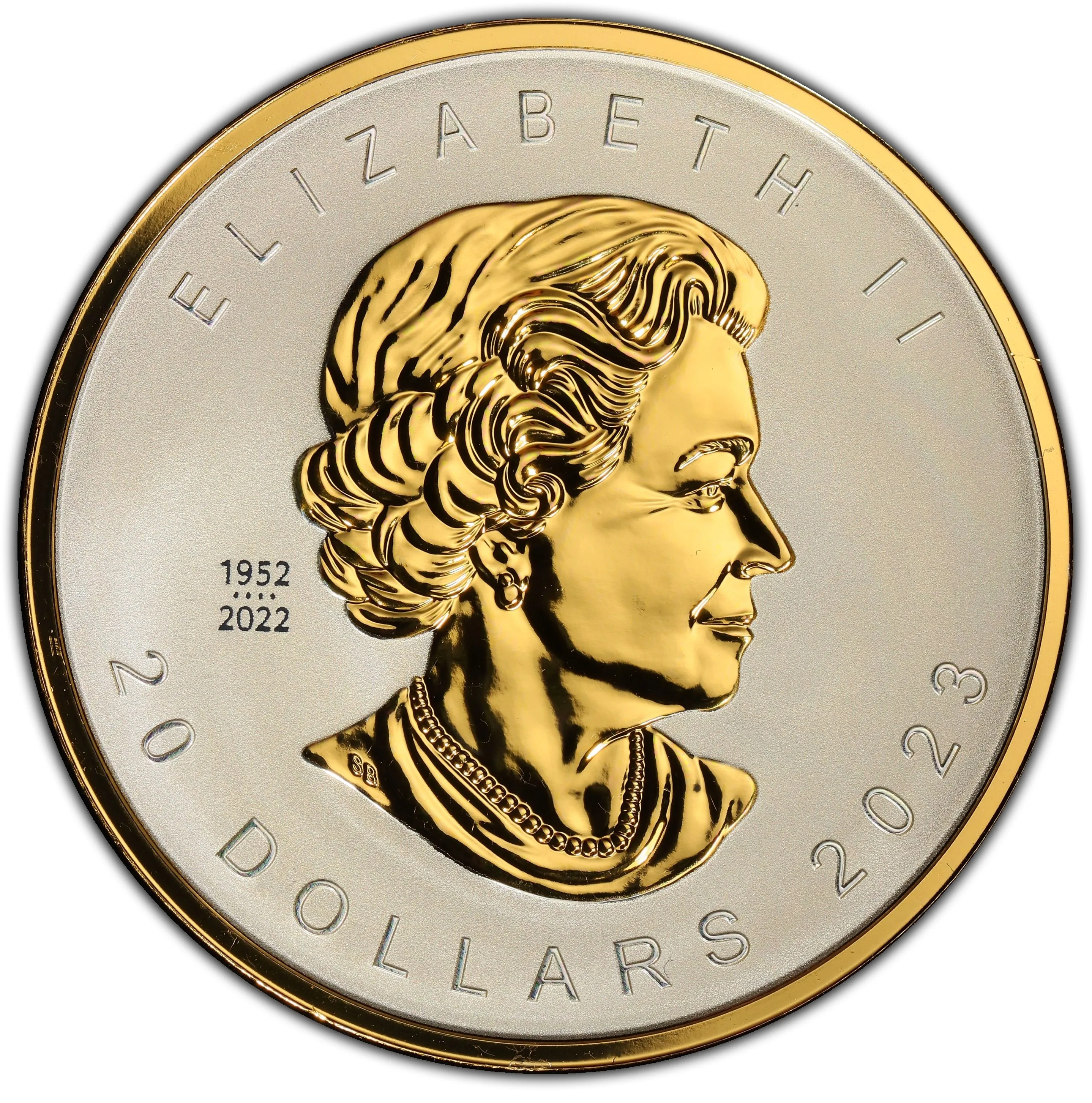 Queen Elizabeth II at 77, facing right, wearing a necklace and earrings. Below, the dates 1952 and 2022 are separated by four pearls, representing the four effigies on Canadian coins during her reign.