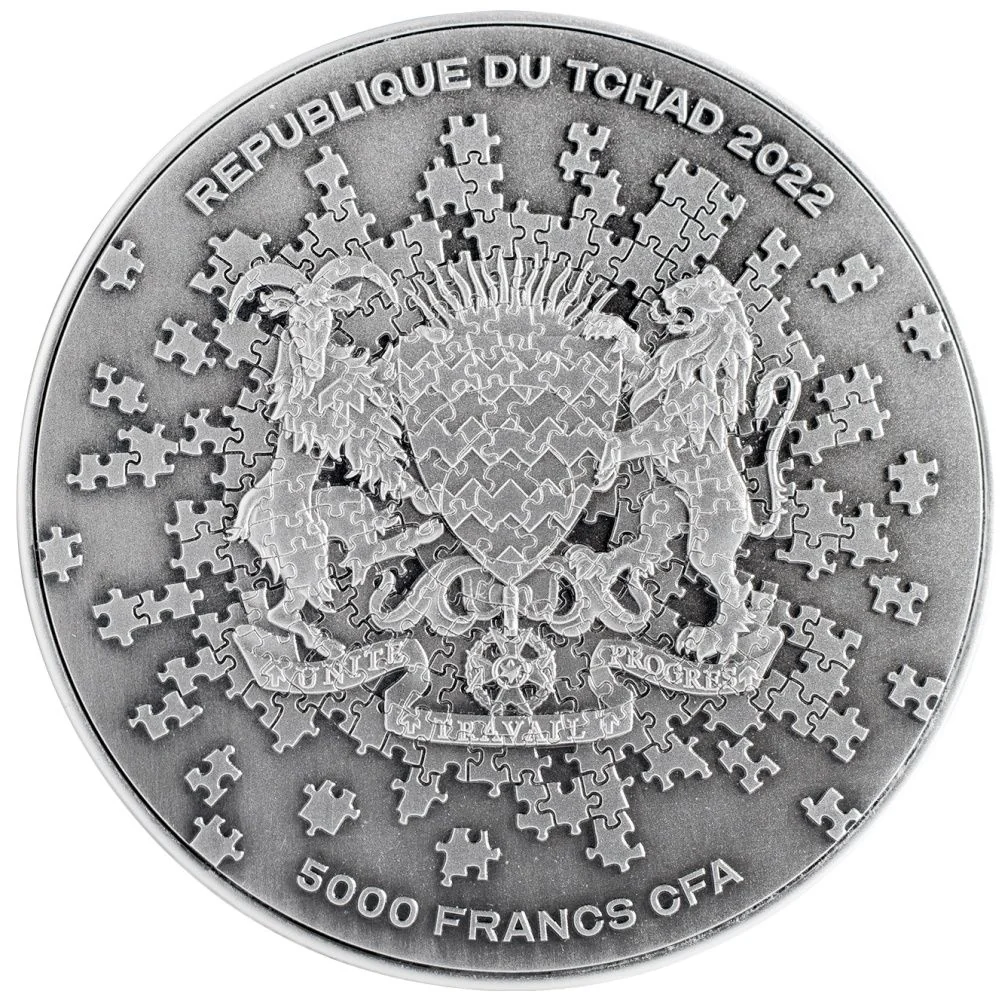 Chad's Coat of Arms encircled by inscriptions and puzzle pieces.