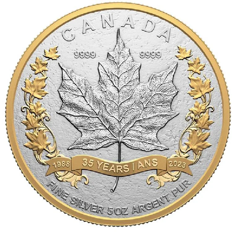 Maple leaf centered with banner, surrounded by smaller leaves.