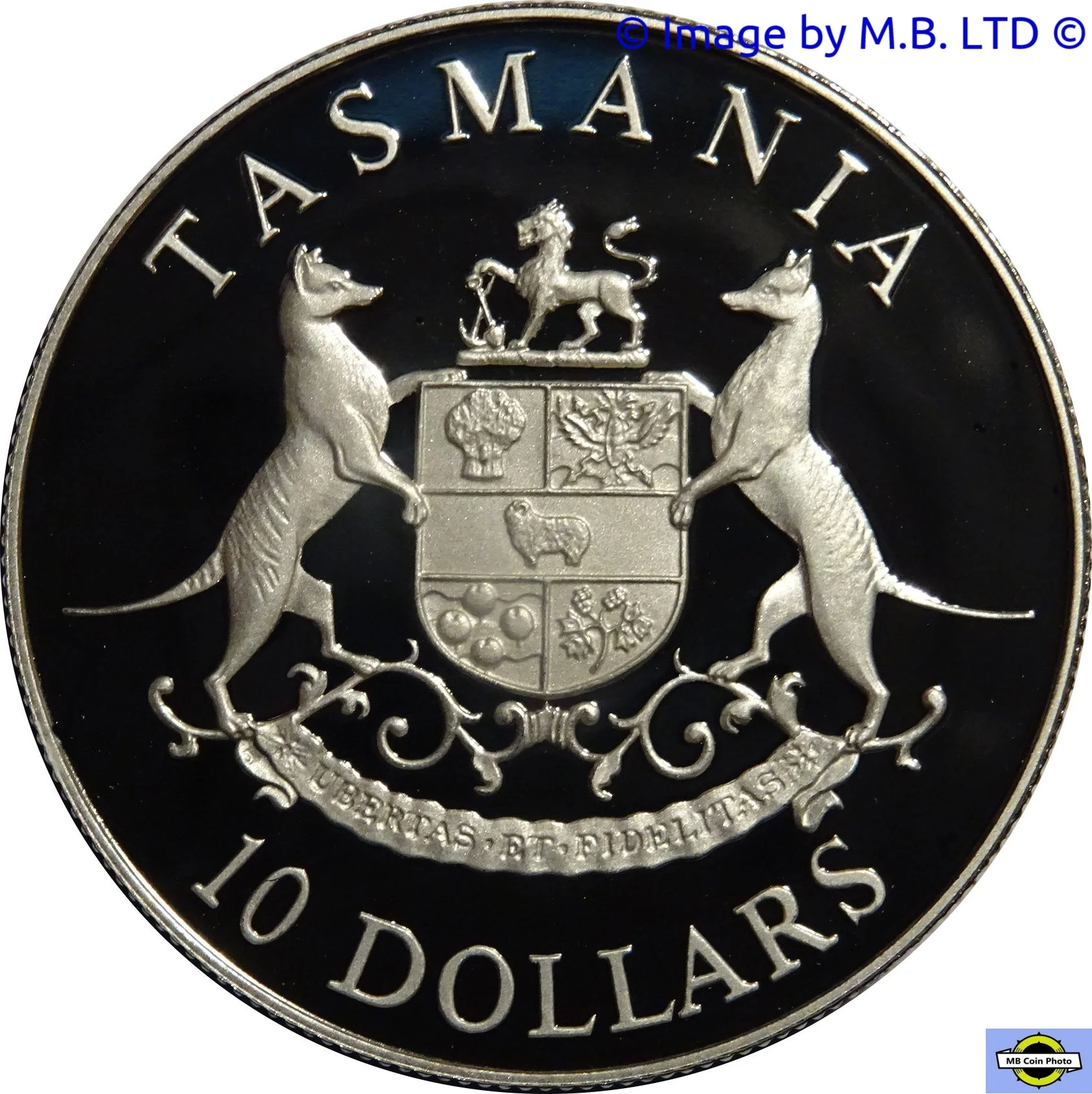 Tasmania's coat of arms features a shield with local industries (apple, wheat, hops, ram), supported by two extinct thylacines. A red lion above holds a spade and pickaxe.