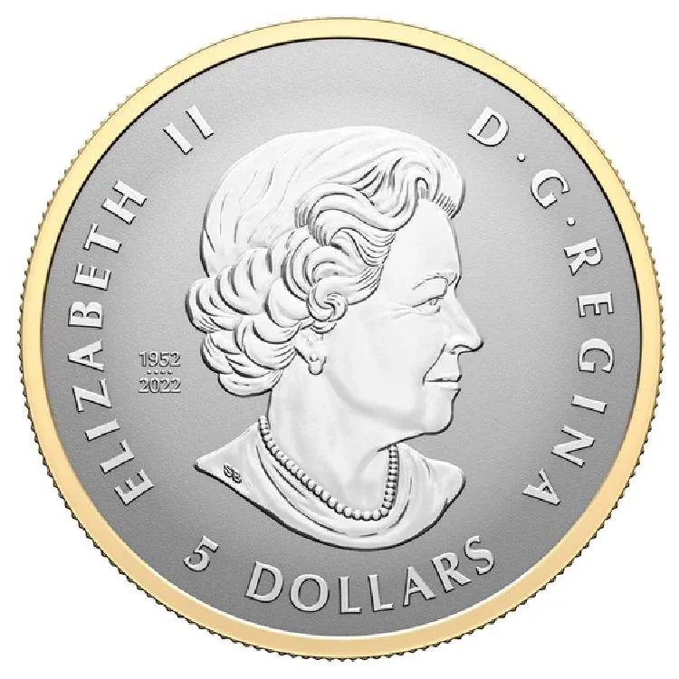 Queen Elizabeth II at 77, facing right, wearing a necklace and earrings. The effigy includes the dates "1952" and "2022," separated by four pearls representing her four coin portraits.