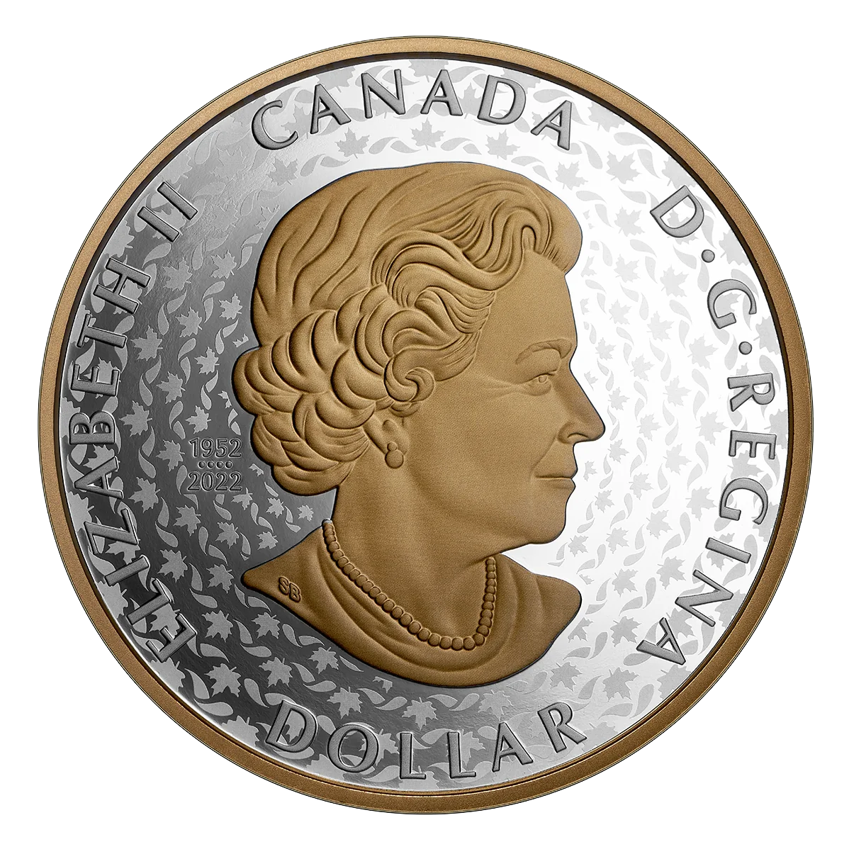 The obverse has a selectively gold-plated portrait of a 77-year-old Queen Elizabeth II facing right, wearing a necklace and earrings. It includes the dual dates "1952" and "2022," separated by four pearls representing her four Canadian coin effigies, against a background of repeating maple leaves and ribbon.