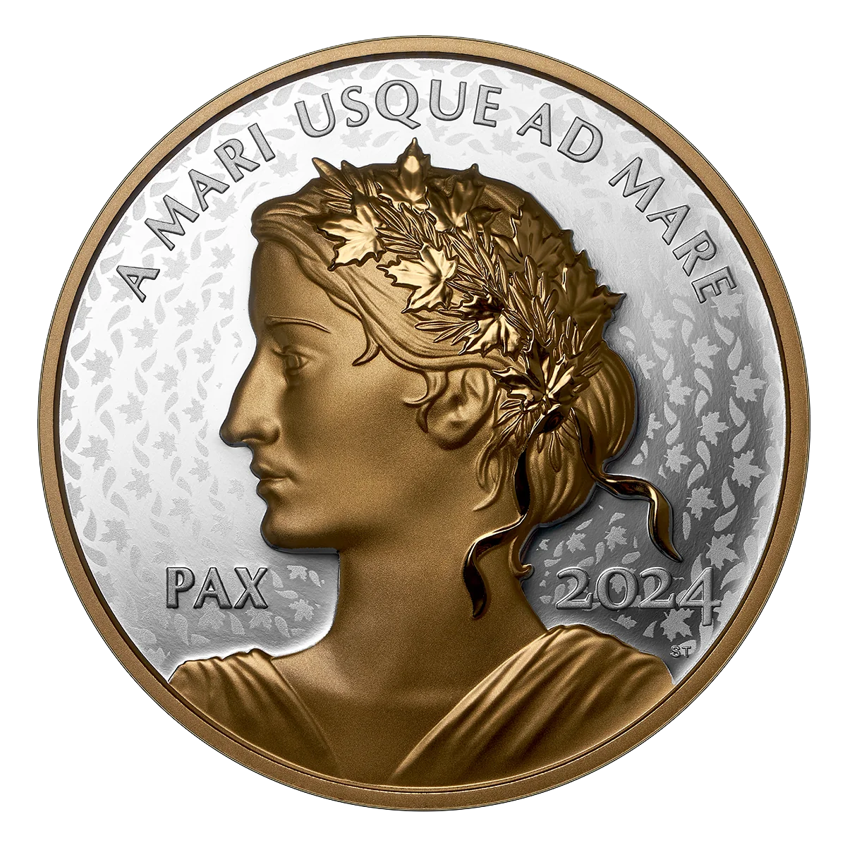 This Peace Dollar's reverse features selective yellow gold plating. Struck in Ultra High Relief, it shows Lady Peace in profile, her hair crowned with a wreath of olive branches and maple leaves that inspired the field pattern.