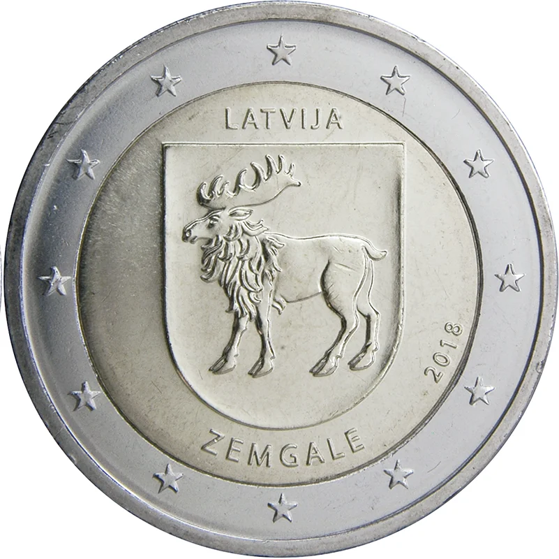 The coin features the Zemgale coat of arms, with "LATVIJA" above and "ZEMGALE" below. The year "2018" is to the right, and the outer ring shows the 12 stars of the European flag.