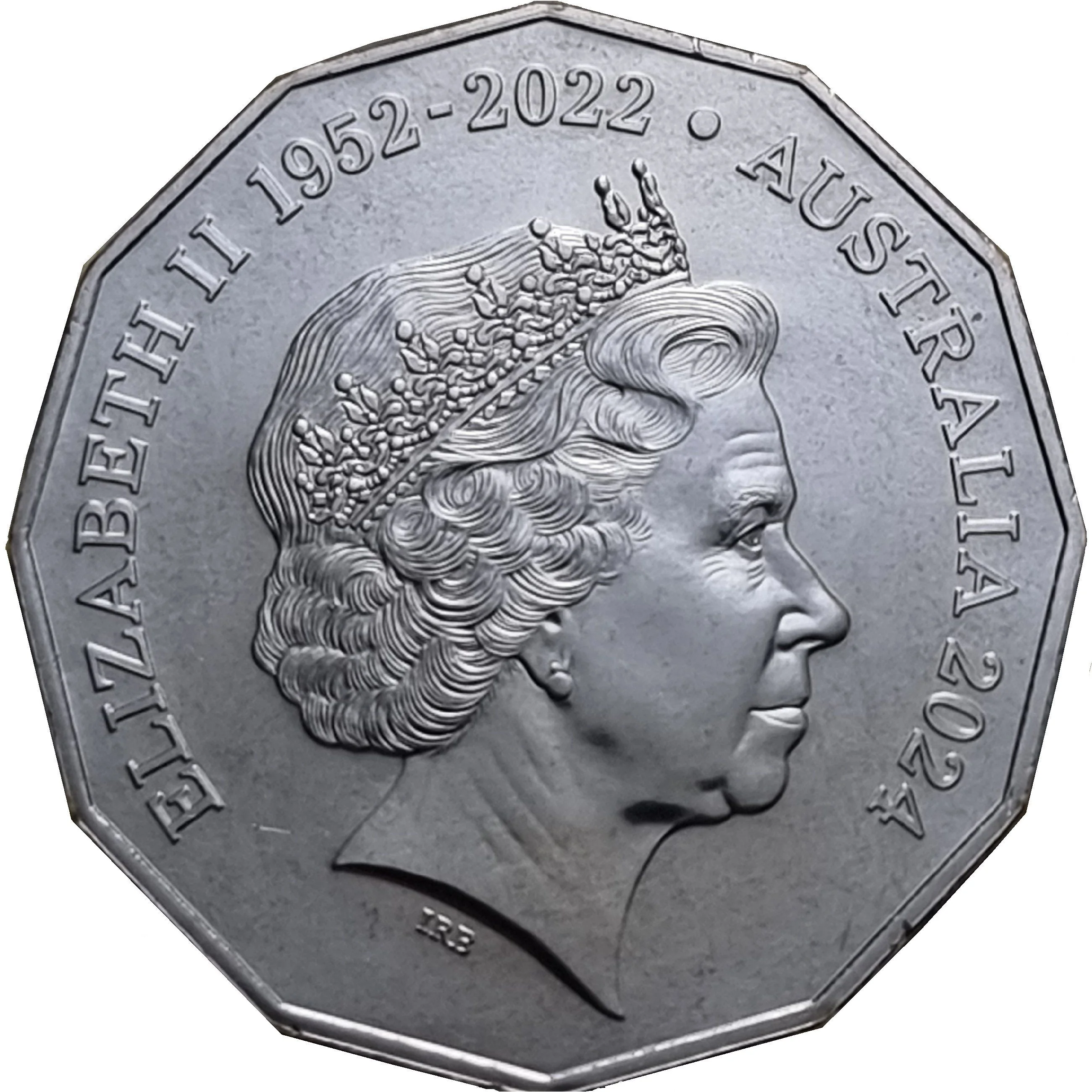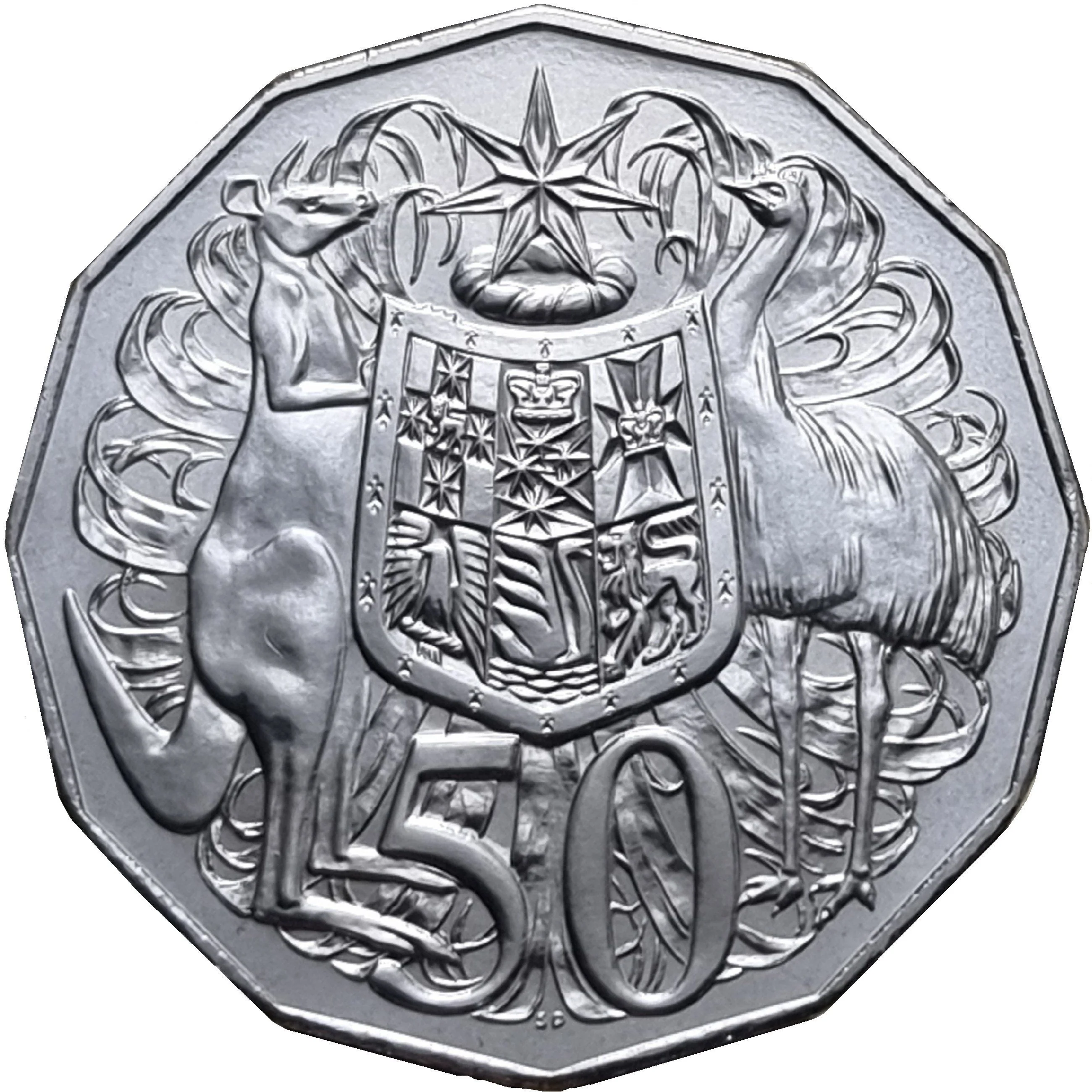 Australia's coat of arms, supported by a red kangaroo and an emu, with the numeral "50".