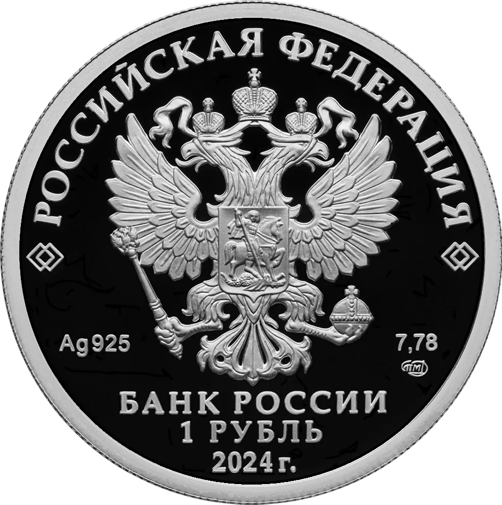 The obverse features the Russian Federation coat of arms, inscriptions for "RUSSIAN FEDERATION" and "BANK OF RUSSIA," the denomination "1 RUBLE," issue year "2024," the metal's chemical symbol, fineness, mint mark, and fine metal content.