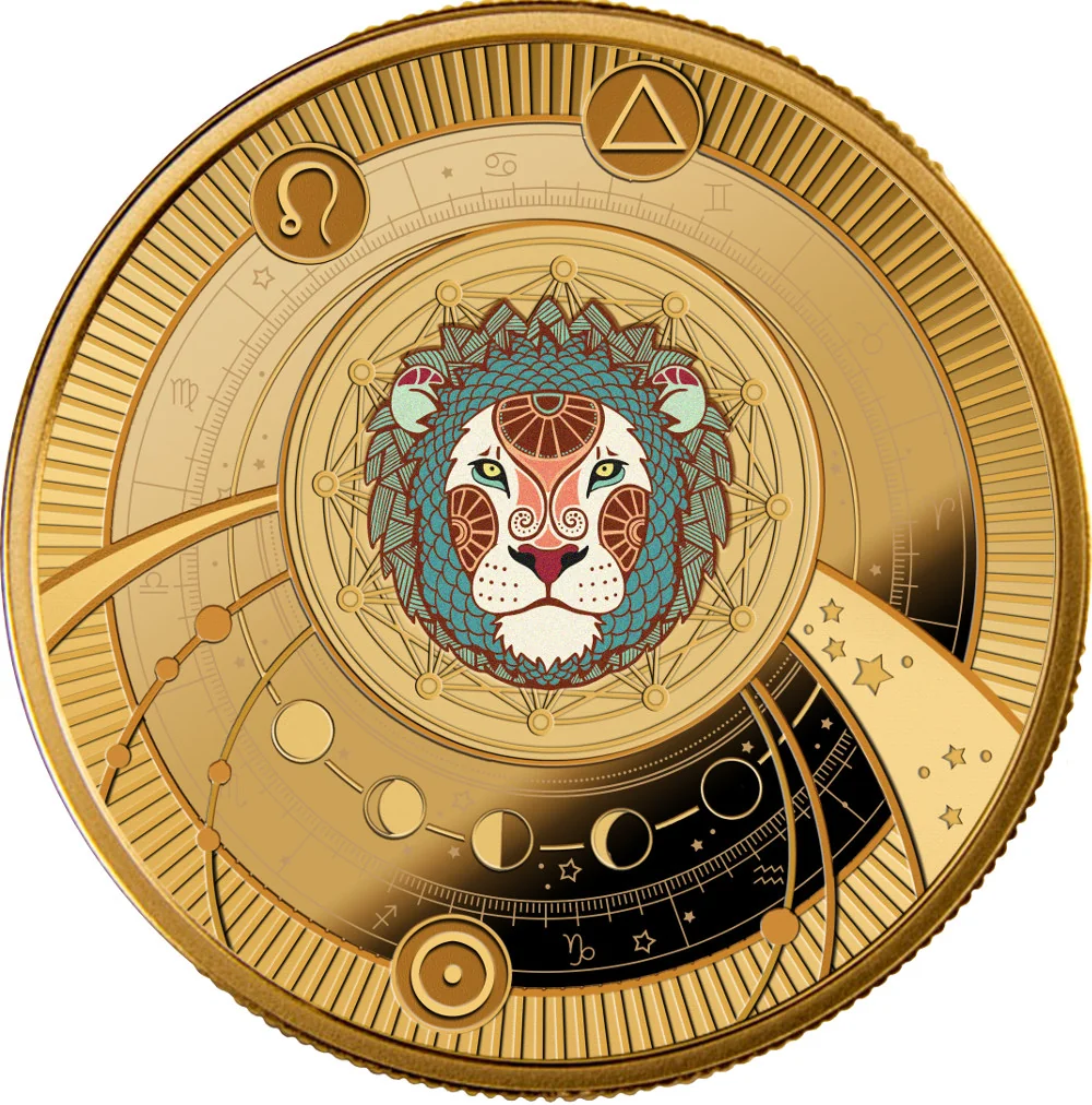 Front-facing multicolored lion head on a disc with zodiac signs and moon phases.