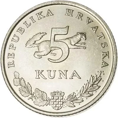 A marten runs right, with "5 KUNA" on its body. "REPUBLIKA HRVATSKA" arcs above, and the national coat of arms below is flanked by a stylized laurel twig on the right and an oak sprig on the left.