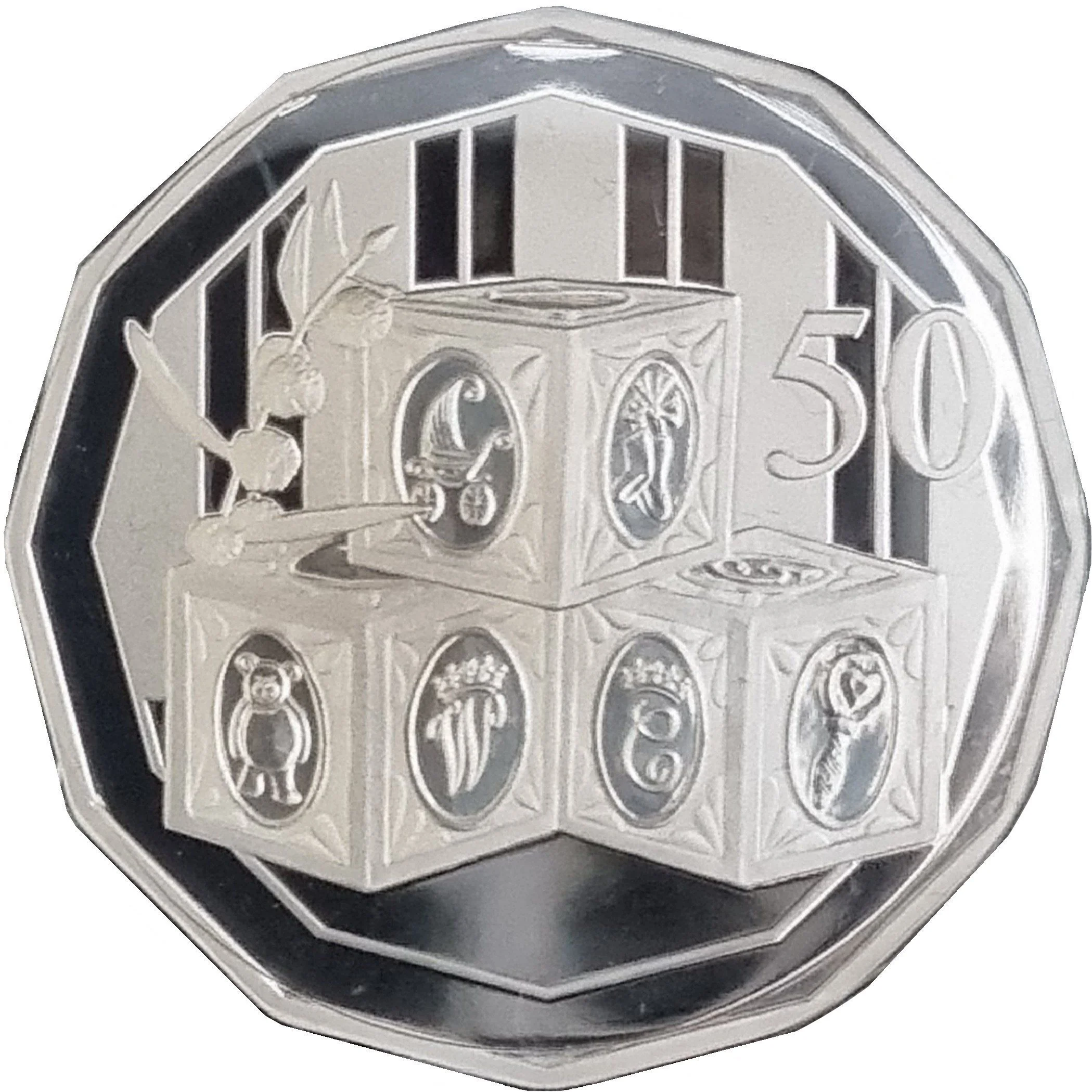 Baby blocks featuring a pram, socks, a rattle, a teddy bear, and the royal cyphers of William and Catherine, with Australian wattle.