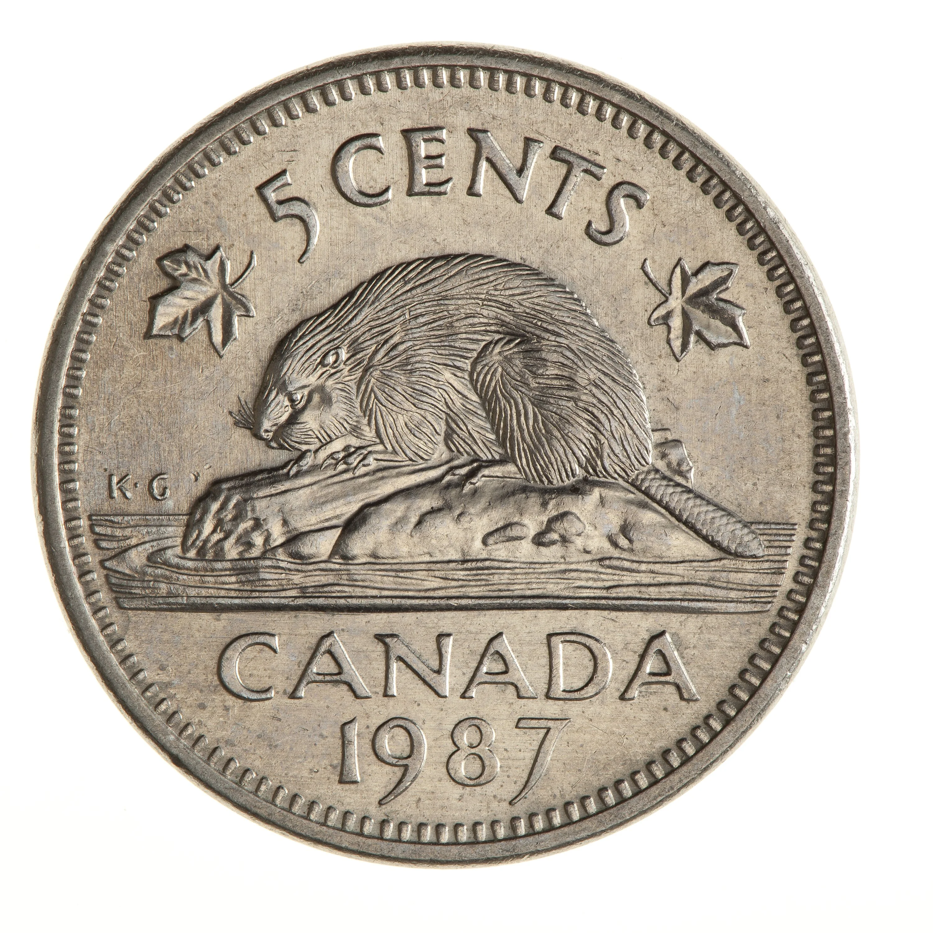 A beaver over the country name, above the date and value, flanked by maple leaves.