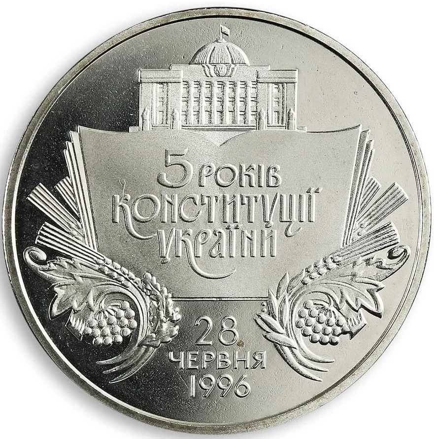 An open book inscribed "5 РОКІВ КОНСТИТУЦІЇ" sits within a frame of wheat and cranberry sprays, above the Verkhovna Rada building and below the date "28 / ЧЕРВНЯ / 1996."