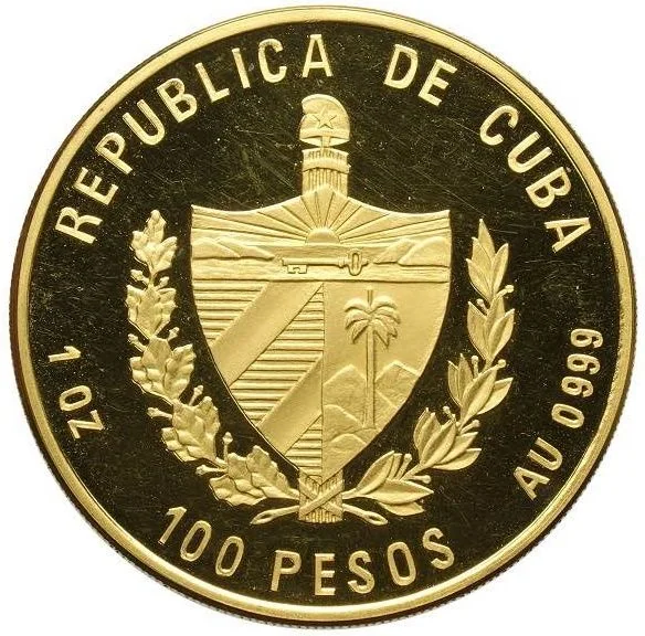 Cuban coat of arms with country name above, face value below, and fineness and weight on the sides.