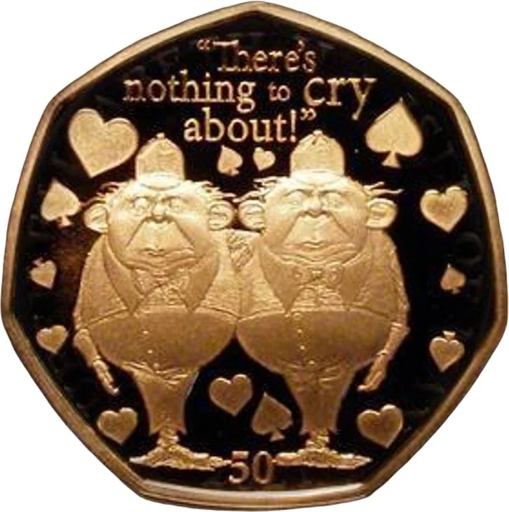Tweedle Dee and Tweedle Dum faced forward, encircled by hearts and spades.