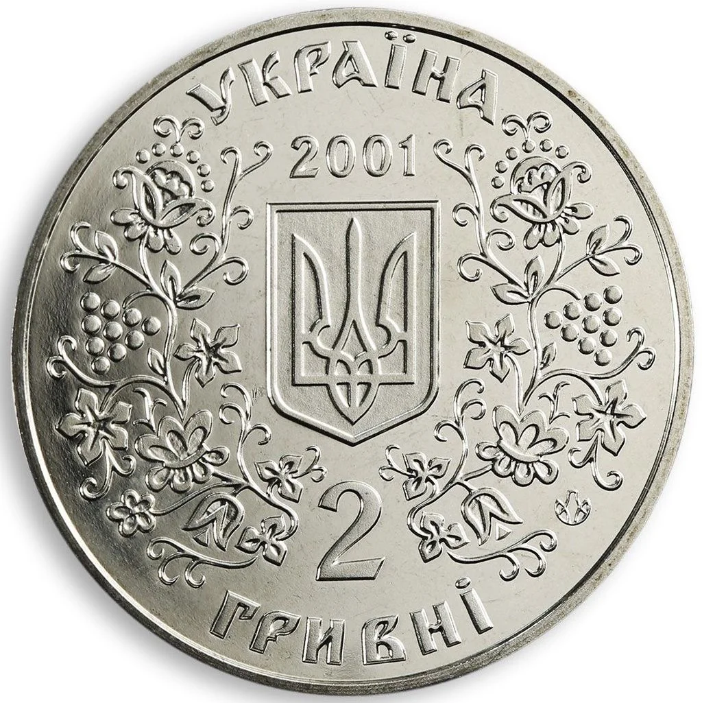 Centered within a stylized floral pattern are Ukraine's small National Emblem, the inscription "УКРАЇНА / 2001 / 2 / ГРИВНІ", and the Mint logo of the National Bank of Ukraine.