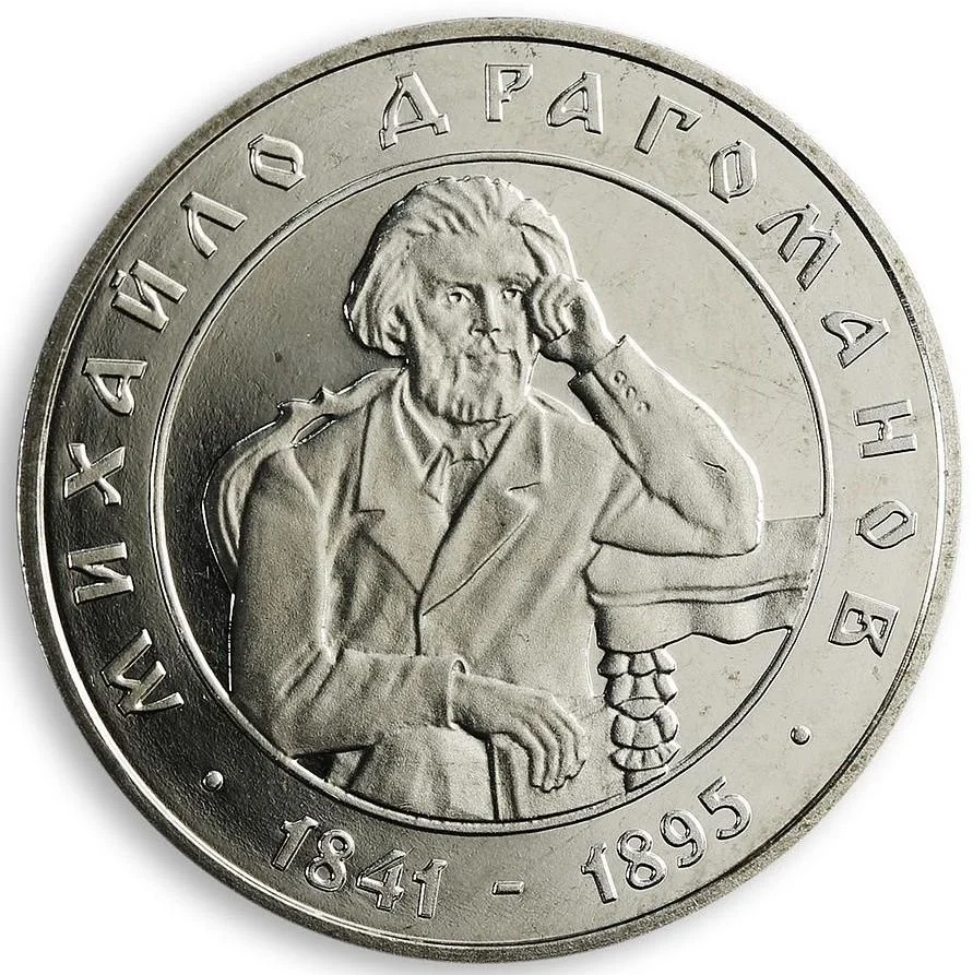 Mykhailo Drahomanov (1841-1895) is depicted seated, leaning on a table with a book in hand. His name and dates encircle the image.