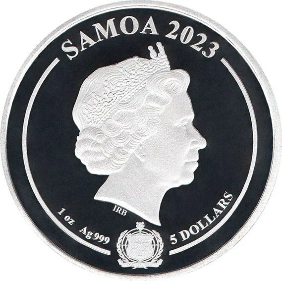 Queen Elizabeth II facing right, with Samoa's small coat of arms below.
