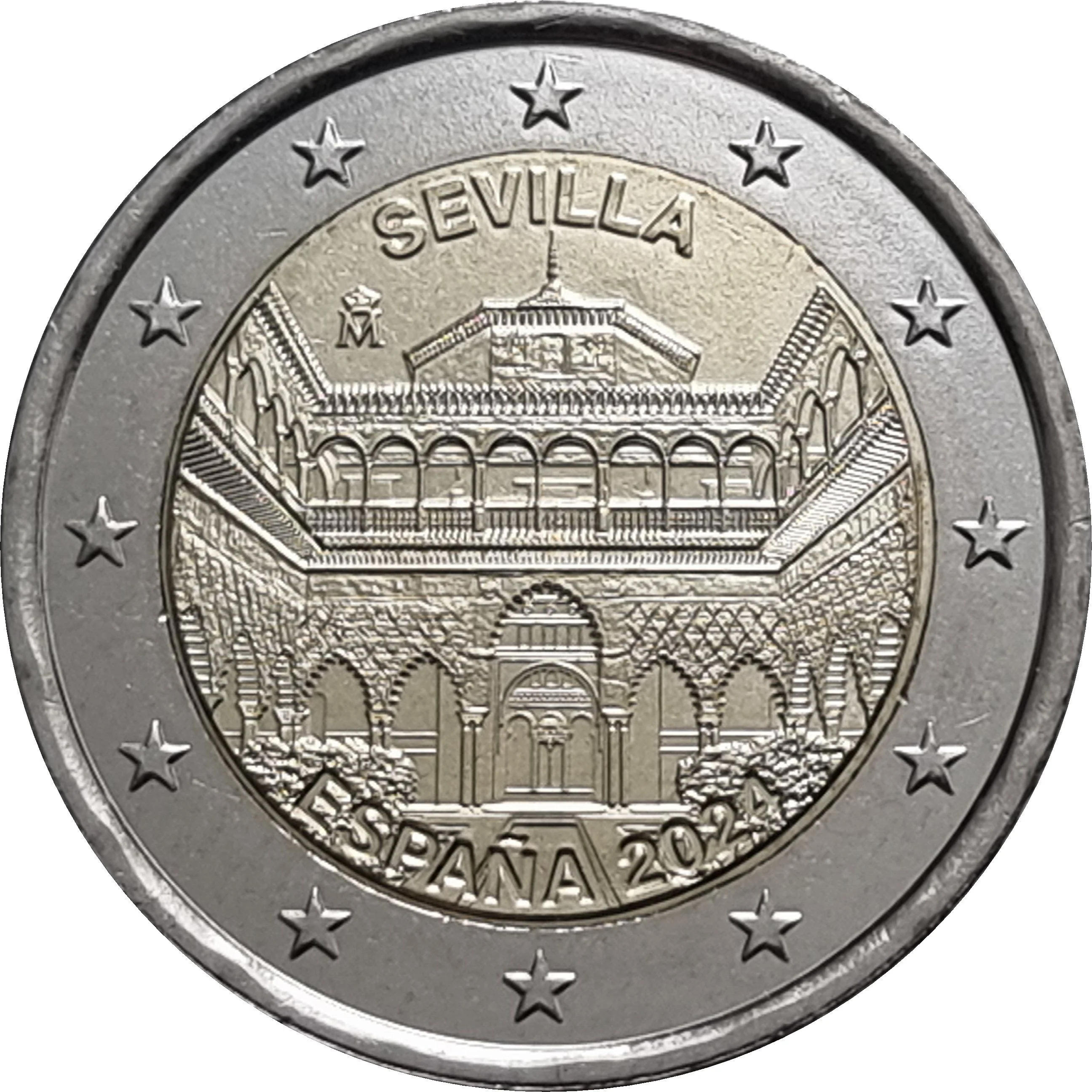 Patio de las Doncellas in the Royal Alcázar, with the EU's twelve stars on the coin's outer ring.