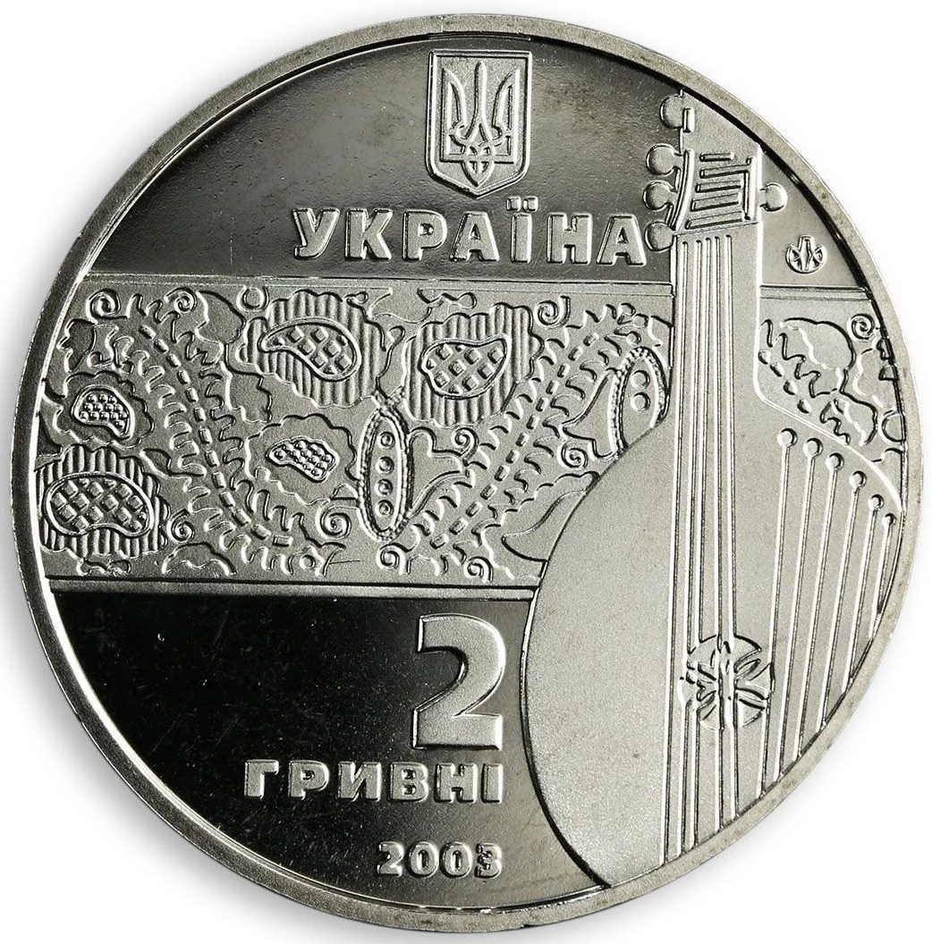 Right: A bandura over an ornamental band, above which are Ukraine's small National Emblem, the word "УКРАЇНА," and the Mint logo. Below: "2 ГРИВНІ / 2003."