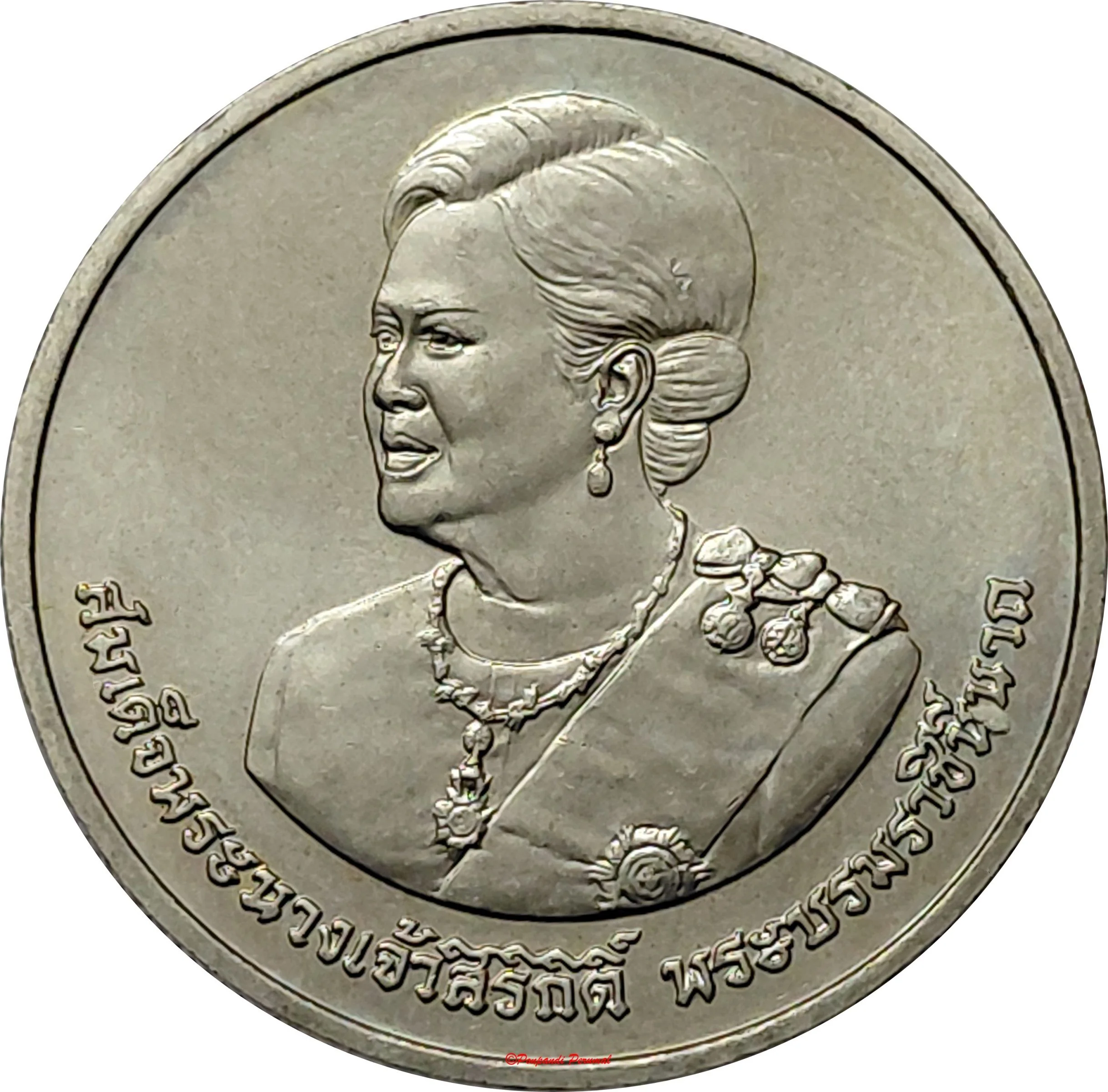 Bust of Queen Sirikit facing left, wearing Thai dress and royal decorations.