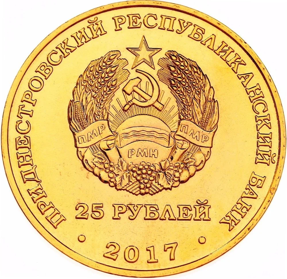 State Emblem of the Transnistrian Moldavian Republic. Circular inscription: top - "ПРИДНЕСТРОВСКИЙ РЕСПУБЛИКАНСКИЙ БАНК" (Transdniest Republican Bank), bottom - "25 РУБЛЕЙ" (25 Roubles). Below the emblem, the year "2017".