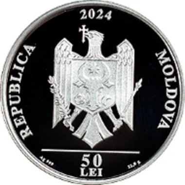 Moldova's 2024 Coat of Arms. Circular inscription "REPUBLICA MOLDOVA", with "Ag 999", "50 LEI", and "22,0 g" in exergue.