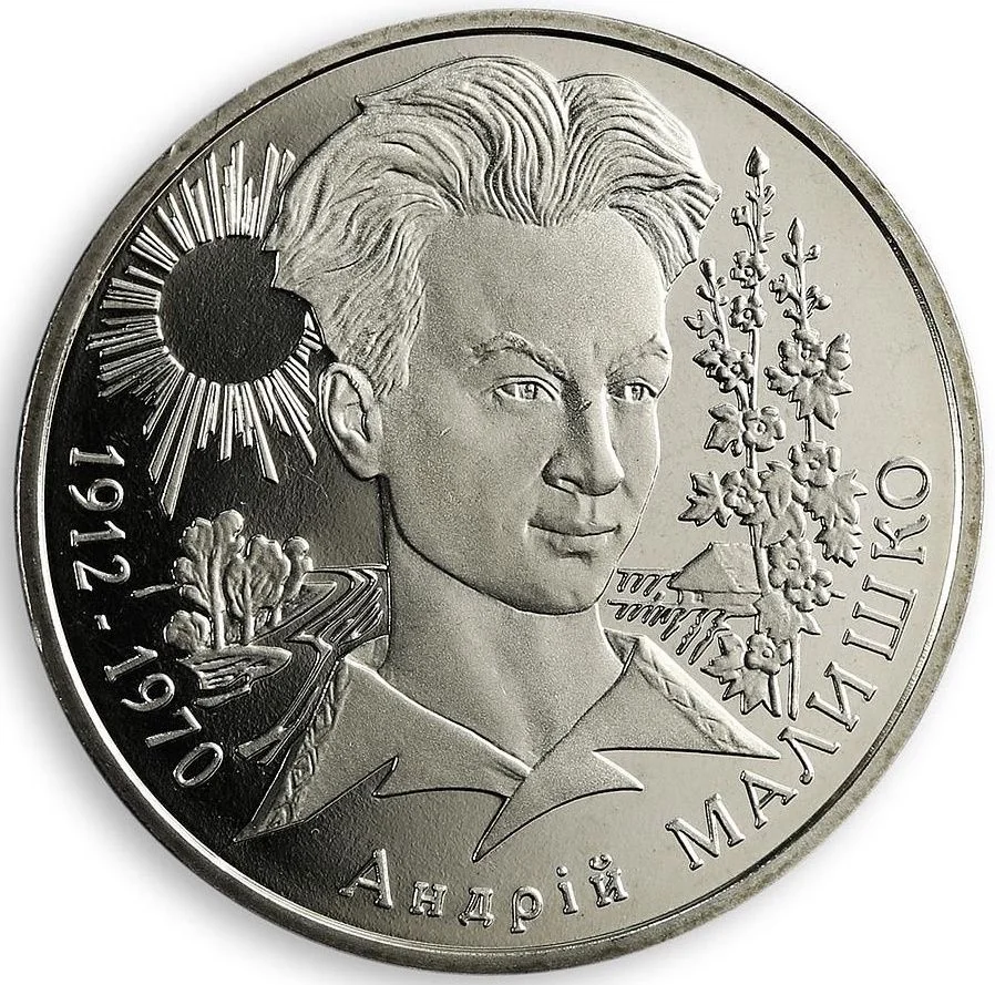 Description: Portrait of Andrii Malyshko against a rural scene: sun and trees on the left, a hut and mallow flowers on the right. Below, a semicircular inscription reads "1912-1970, АНДРІЙ МАЛИШКО."