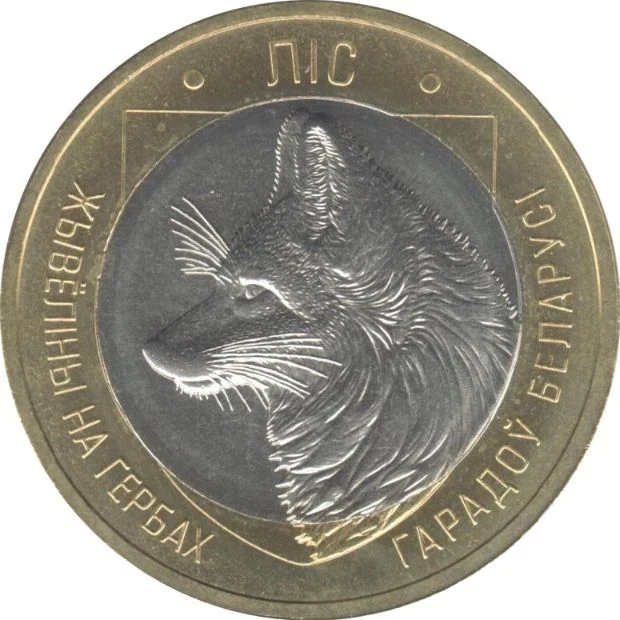 Fox head on a shield. Top: ЛIС. Sides: ЖЫВЁЛІНЫ НА ГЕРБАХ ГАРАДОЎ БЕЛАРУСІ.