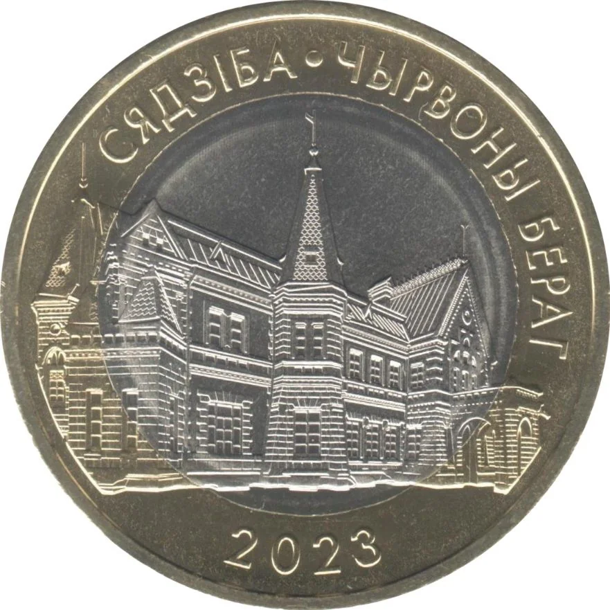 Description: The Red Coast palace and park complex in Zhlobin is at the coin's center. The top inscriptions read "СЯДЗІБА" and "ЧЫРВОНЫ БЕРАГ," with the issue year at the bottom.