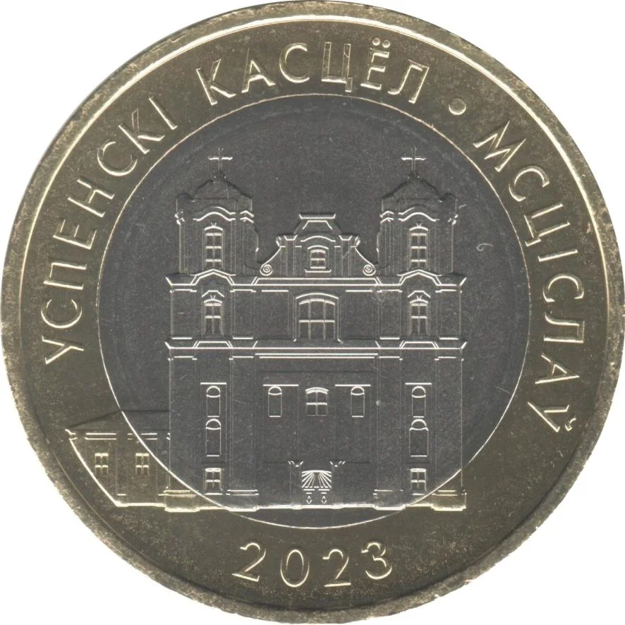 Center: Church of the Assumption of the Mother of God in Mstislavl. Top: УСПЕНСКІ КАСЦЁЛ, МСЦІСЛАЎ. Bottom: issue year.