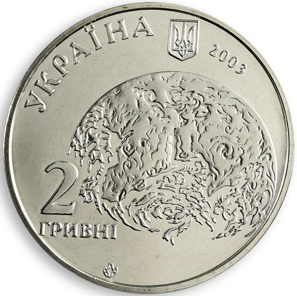 Above a depiction of Earth, the cradle of mankind, are the small National Emblem of Ukraine and the inscriptions: УКРАЇНА, 2003 (in a semicircle above) and 2 ГРИВНІ (below), along with the Mint logotype of the National Bank of Ukraine.