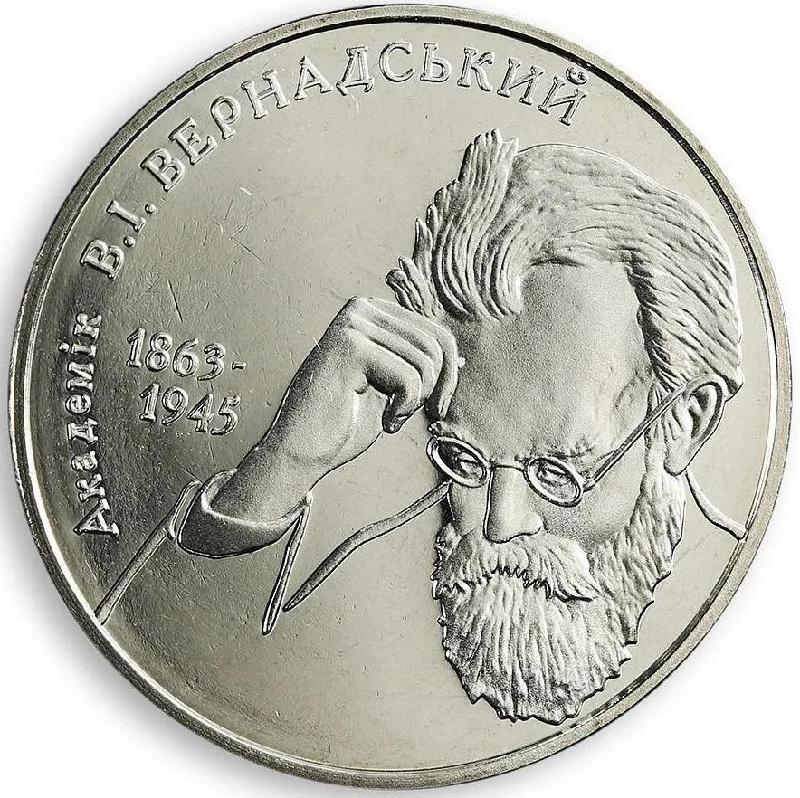 Portrait of Volodymyr I. Vernadskyi (right), encircled by inscriptions: "В.І. ВЕРНАДСЬКИЙ" (left) and his lifespan "1863-1945" (two lines).