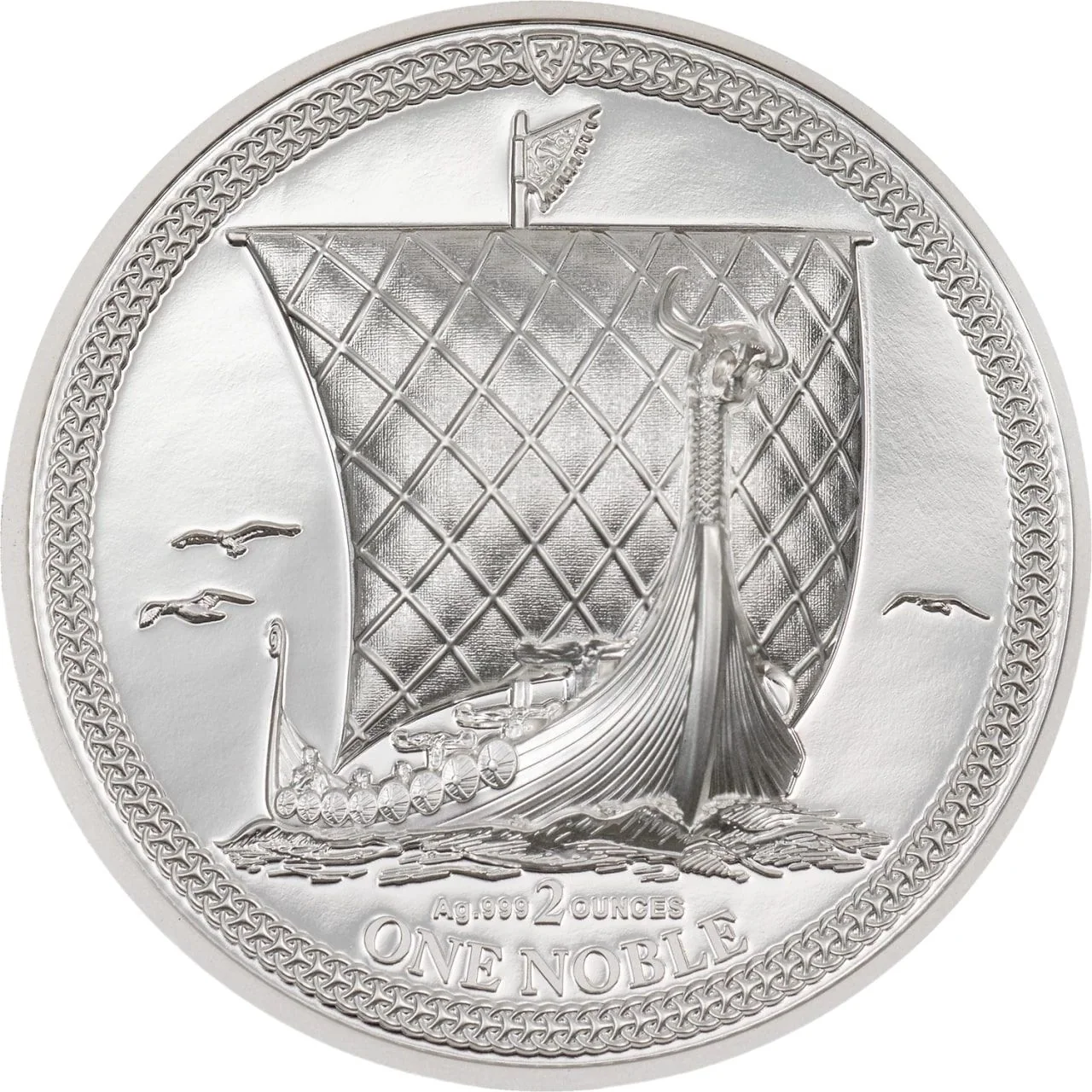 A Viking longship under sail, framed by a Norse border and topped by the Manx triskelion.